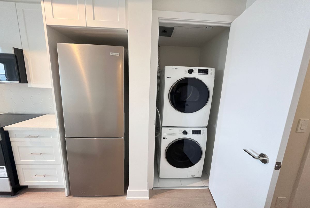 Two years old Luxury Ellie Condo at core of North York.1 Bed+Den,2 Full Bath,Den is a seperate room with door,Can Be Used As Second Bedroom.Upgrade kitchen Cabinet&counter top.9Ft Ceilings,Laminate floors throughout.Stainless Steel Appliances, Stacked Washer And Dryer.Steps To Subway, Supermarket, Restaurants And All Amenities.