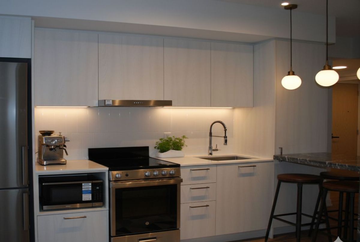 Welcome to this beautiful 2-bed, 2-bath condo at the Festival Condos! This sun-filled, southwest-facing unit features 8'6" ceilings, a functional layout, and a spacious, unstructed balcony. The designer kitchen is equipped with premium S/S appliances. Includes one parking space and ensuite laundry. Located in the vibrant VMC, you're steps from Cineplex, Costco, IKEA, and dining. Building amenities include a 24-hr concierge, fitness center, and the Festival Club. Utilities for the building are provided by Provident. Average monthly bills typically range from $130-$150. ***Photos are virtually staged.